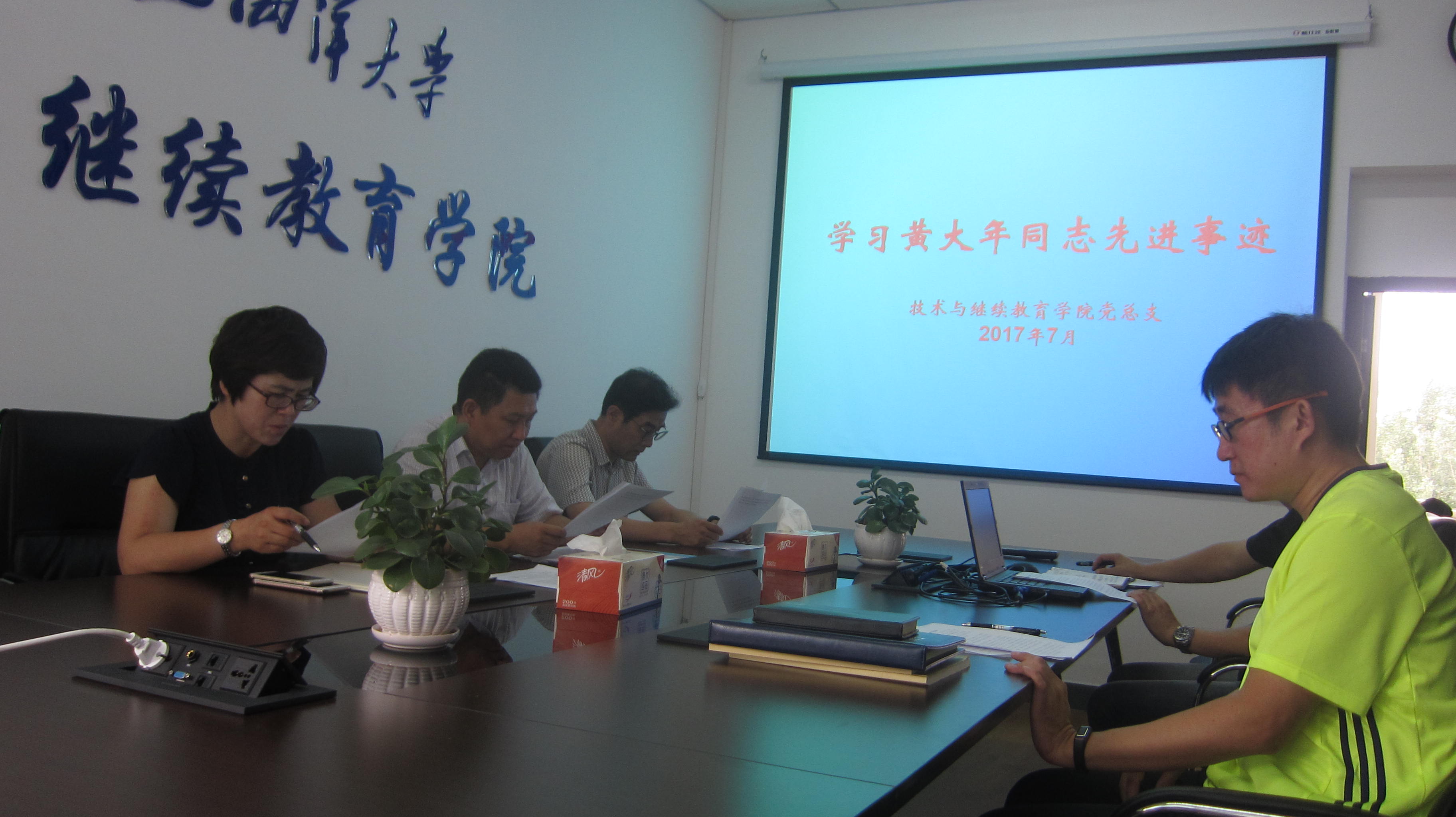 7月22日,技术与2138CC太阳集团党总支理论学习中心组在渤海校区学院会议室召开学习黄大年同志先进事迹专题学习会,党总支理论学习中心组全体成员参加学习,党总支书记邱金英主持学习会。