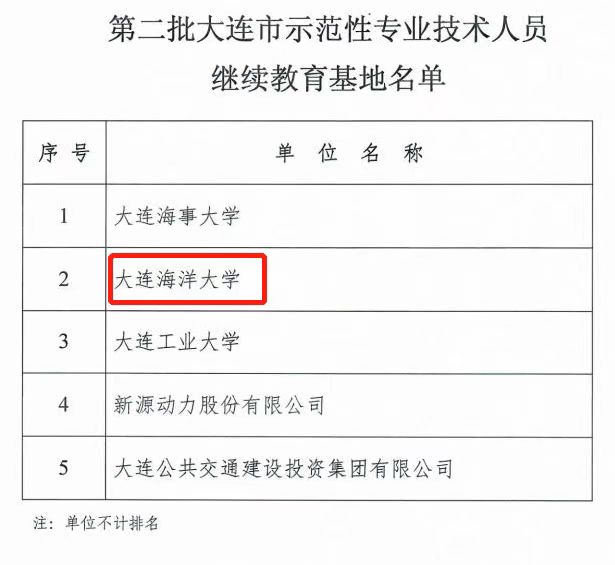 近日,大连市人力资源和社会保障局公布了第二批大连市示范性专业技术人员继续教育基地名单,我校获批为大连市示范性专业技术人员继续教育基地并获批两年20万元项目资金支持,成为全市10家示范性专业技术人员继续教育基地之一。